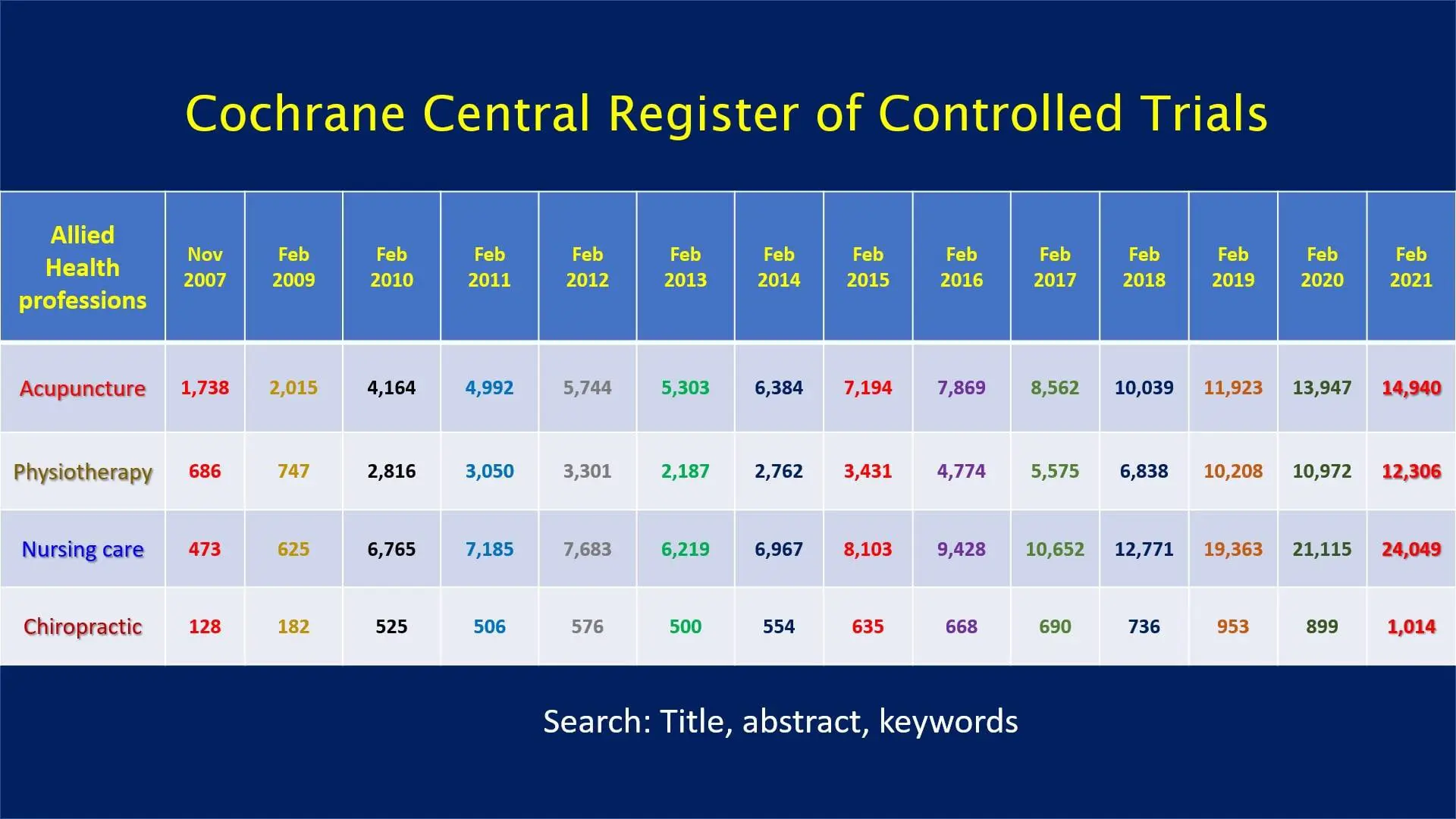 Registrerede kliniske forsøg med akupunktur rangerer meget højt på denne liste, og tabellen viser, at akupunktur er et fagområde, der laves særdeles meget forskning i.